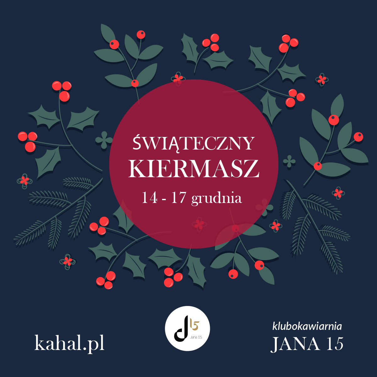 Zapraszamy wszystkich do klubokawiarni JANA 15 po piękne świąteczne ozdoby,  książki, słodkości, herbaty. ŚWIĄTECZNY KIERMASZ będzie się odbywać od 14 – 17 grudnia w godz. 16.00 – 19.00 w klubokawiarni JANA 15 w Wodzisławiu Śl.